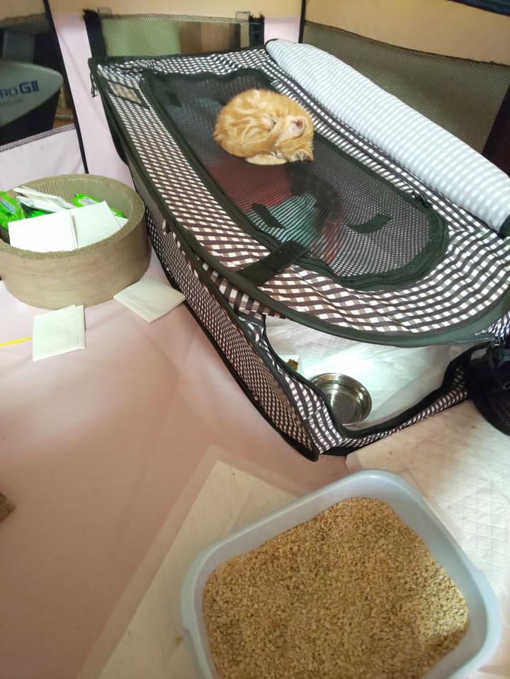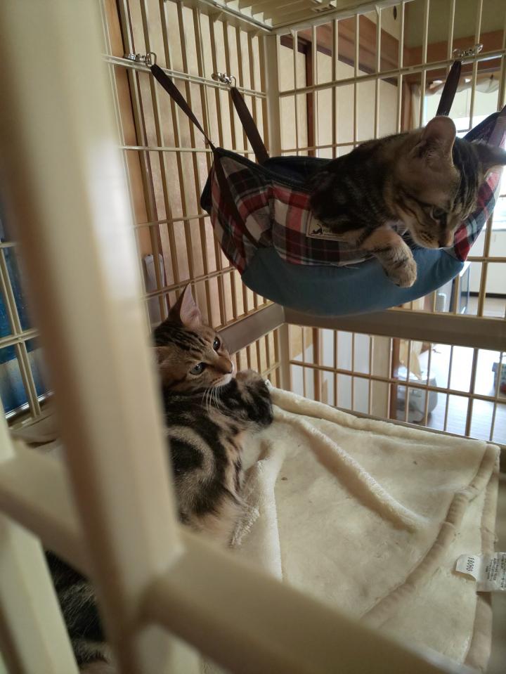 ポータブルケージの上でハンモック状態でねるヨッちゃん