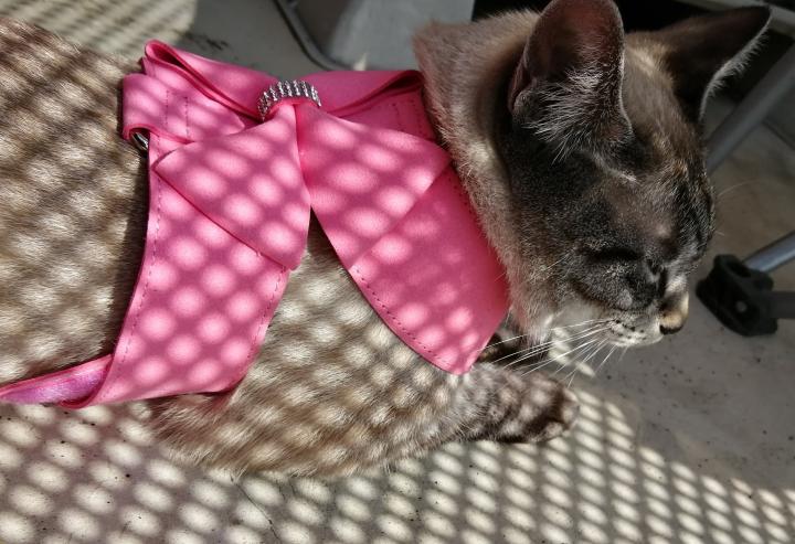 おニューのハーネスをつけてあげたら、紐はいやにゃーーーと