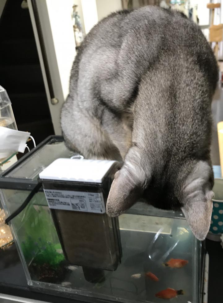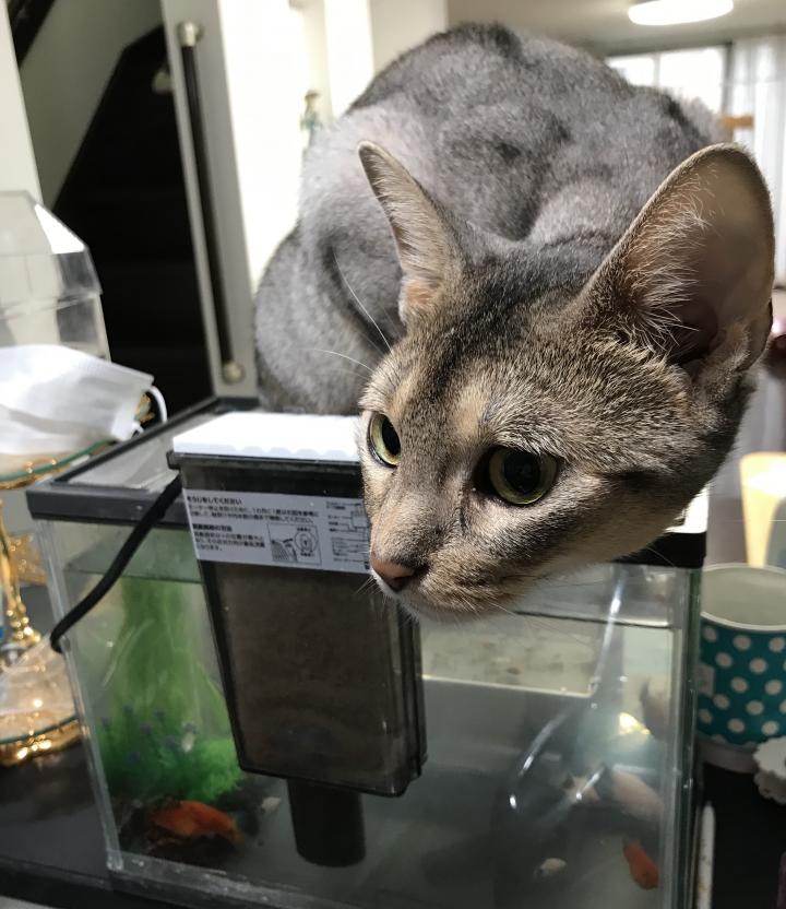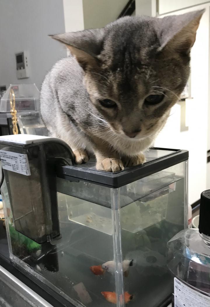 😸飼主が水槽の水換え中フタが無いのを分からずに登ろうとして前足で魚釣りしてました💦