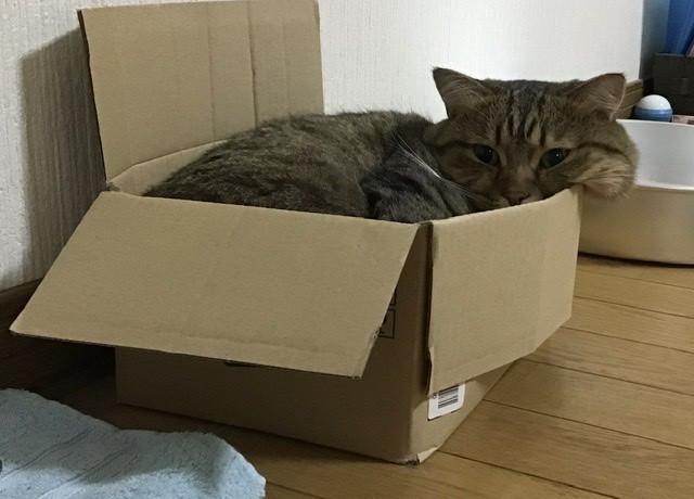 それで、ダンボールに入ってるたぬきねこに「たぬきねこ、一緒に長生きしような」と言ったら…たぬきねこ、お目々をパチパチ。