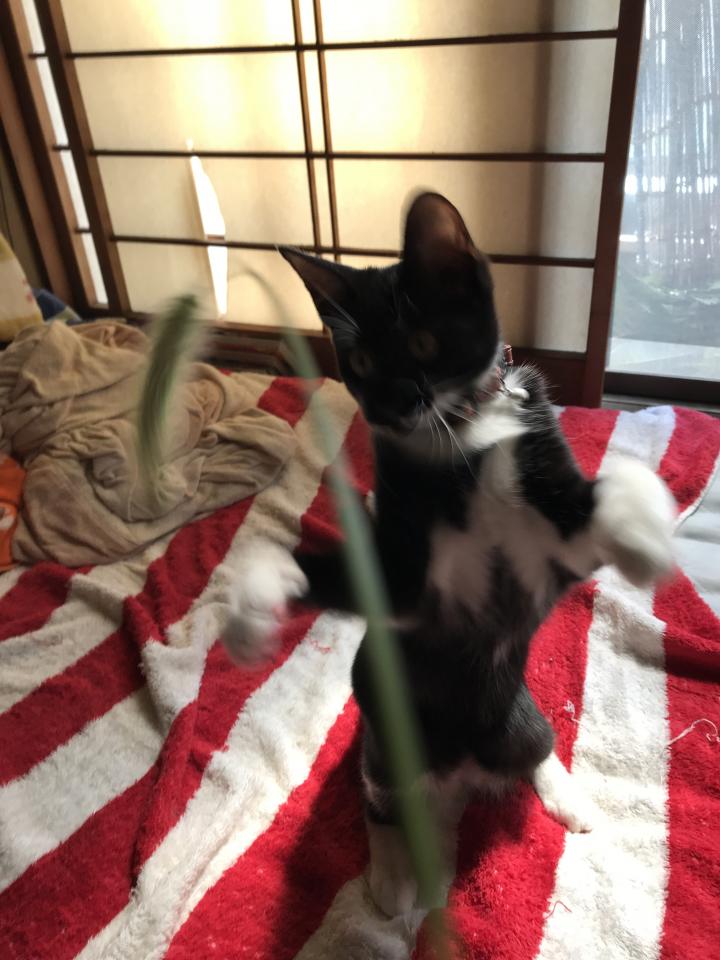夜私もネコじゃらしで遊んでいると短い声でにゃにゃにや、かっかっか〜と、
