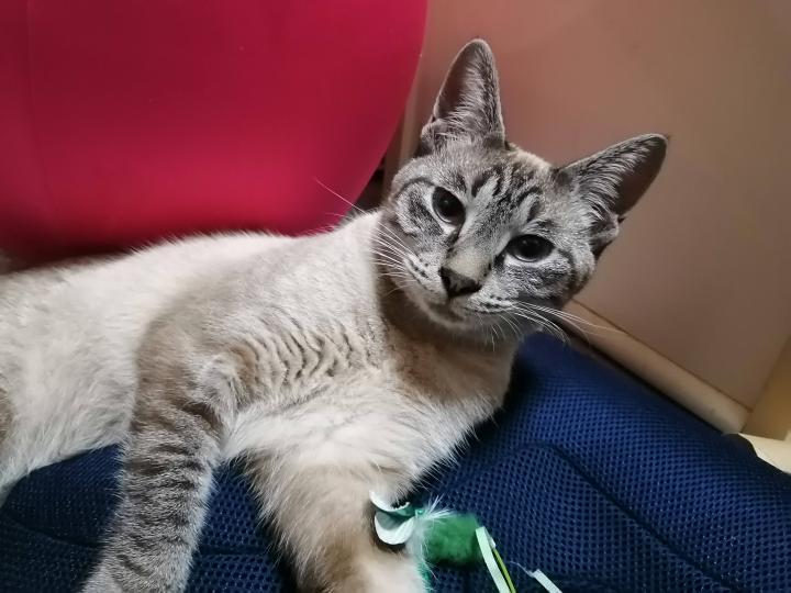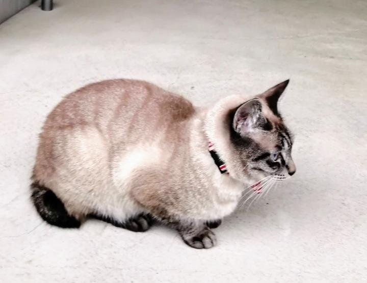 ペロペロしたり、首をひねって舐めちゃうので頭の上の方につけています。
