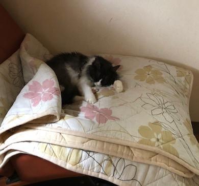 私の座っている椅子に人間の子供みたいにつかまり立ちして、ニャーニャーと何か訴えて、それから落ち着きなく動き回る時があります。お腹が空いてるばかりではないようで、私が後をついてくと走って自分用の和室に行きます。抱っことかあまり好きじゃないのに、そばにはいて欲しいようです。一緒に和室に行ったら自分用の布団で眠り始めました。