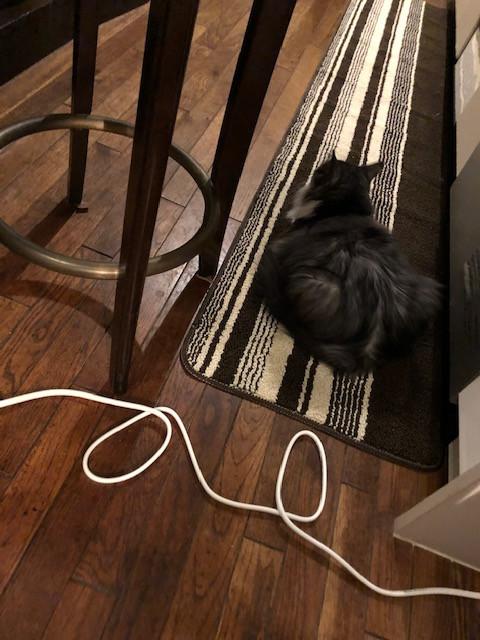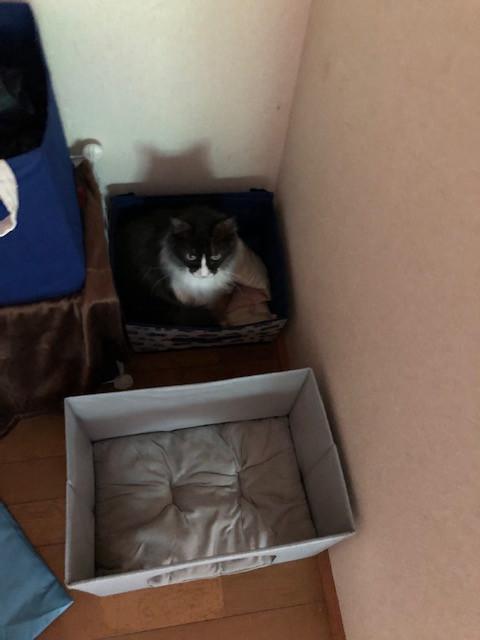 で、結果はこんなです。手前のナナが入ろうとしないグレーの箱が猫用ボックスです。その後ろにたまたま置いてあった収納ボックスがナナのお気に入りです。