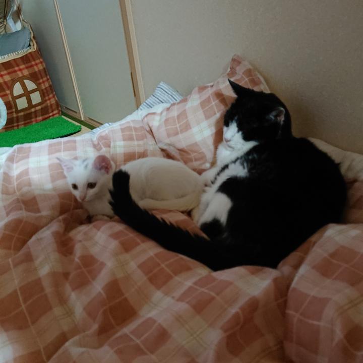 カリンが帰って来てからのにゃんずは、やっぱり心配なのか、代わる代わる様子を見に行ってます。
