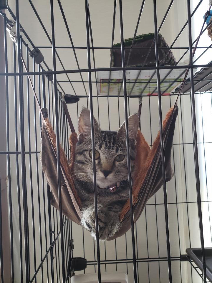 昨日、ハンモックをフワフワの面に変えたよー?気づいたかしら、むぎちゃん?