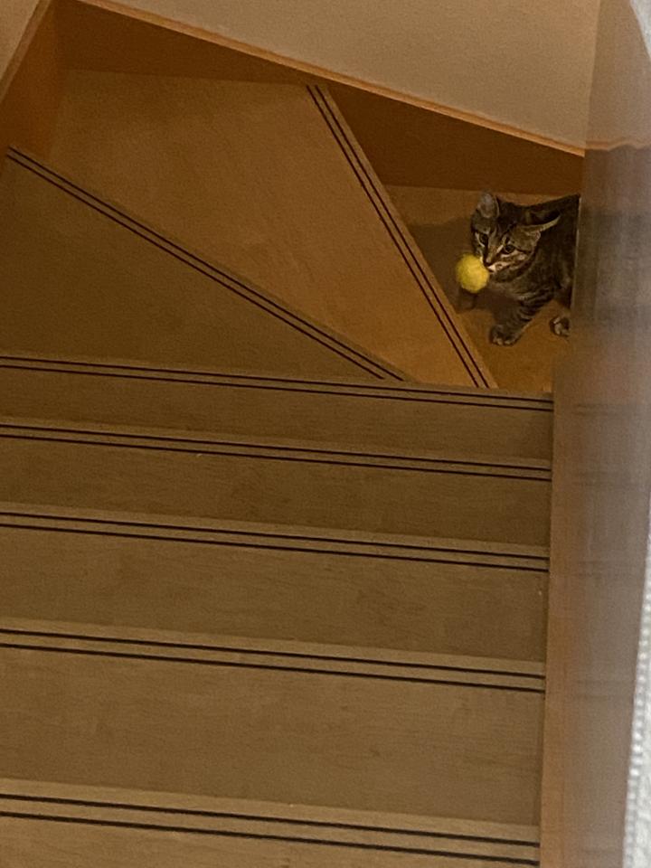 おもちゃを落とすと急いで追いかけ、捕まえて持って上がってきます。