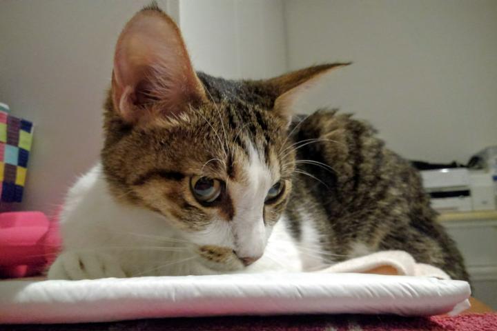 ベッドになんとかよじ登ってきて香箱座りをしているのだが、