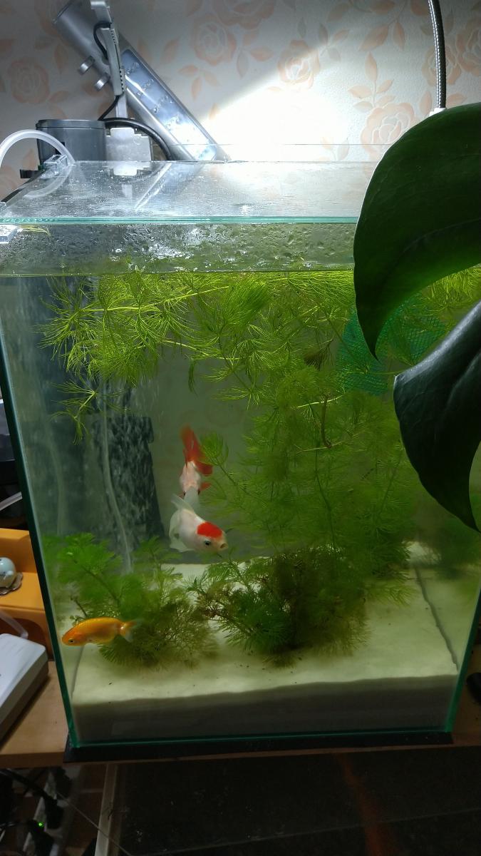 主に金魚3匹と、カボンバ、マツモが入っています。
