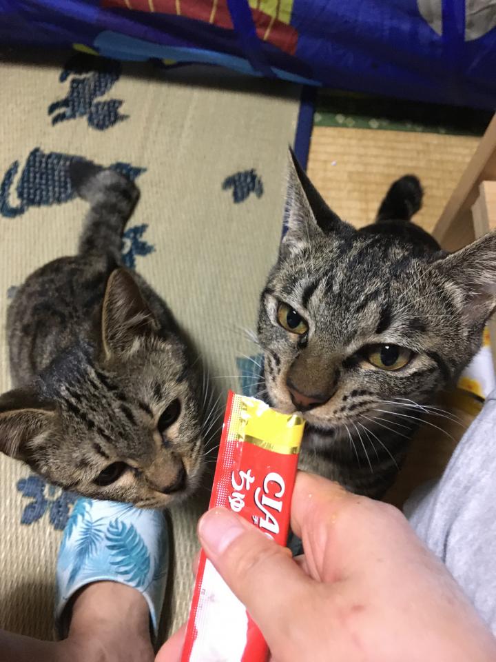 グイグイ来るから、床にちゅ〜る置いたら1号くんと一緒に家入って来た。