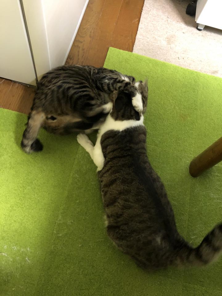 直ぐにセナはコテっとお腹を見せて、手加減しながら仕方なく相手をしてあげていますが、普段はとても気性が荒いのに、大福は後ろ足が麻痺しているので、ケリケリは出来ないので、頼るは前足の力のみでセナにじゃれじゃれを挑む。