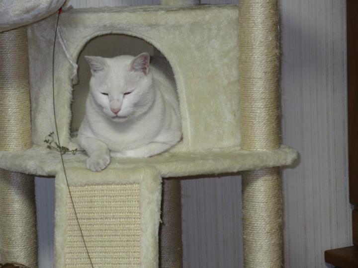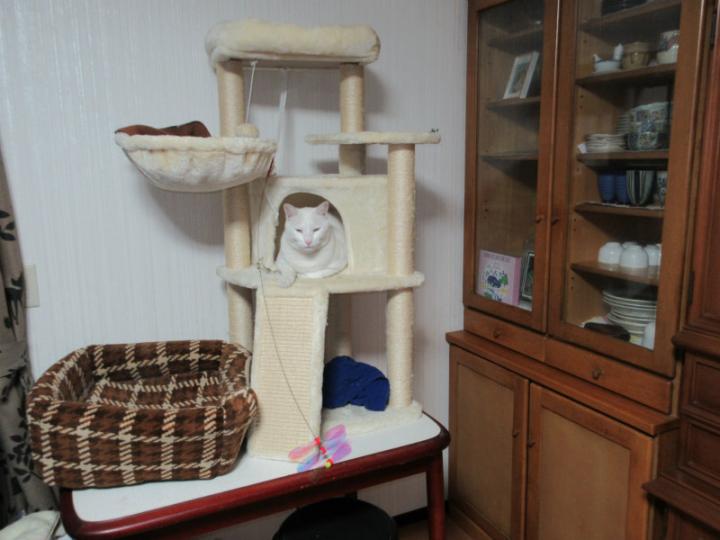 私が帰って来る前にシロちゃんはタワーの色々な場所を臭いそして隣の食器棚の上にとびのりそこから落ちたそうです