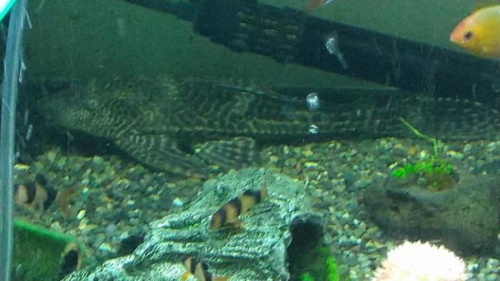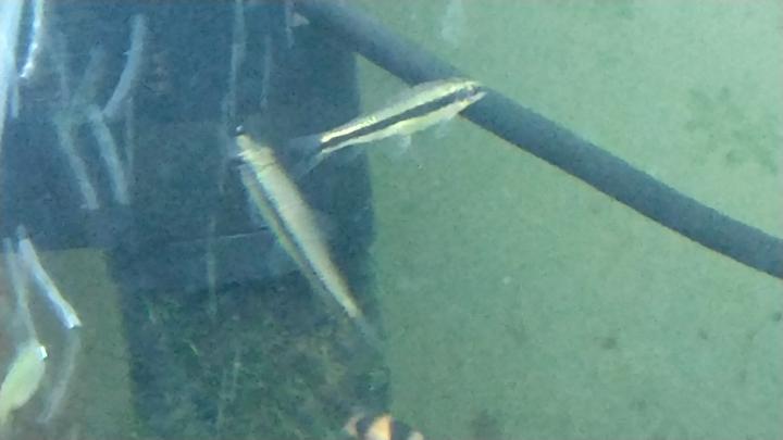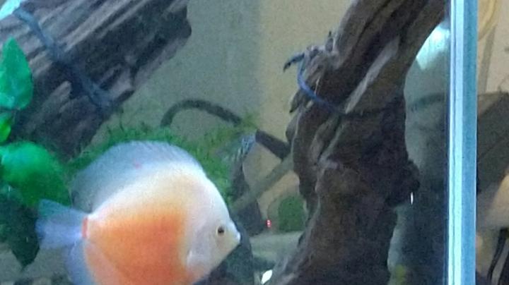 ディスカス1ぴき、レインボースネークヘッド1ぴき(上の方にチョコンと顔を覗かせているのがスネークヘッドです。顔だけ見てると亀の様❤️)