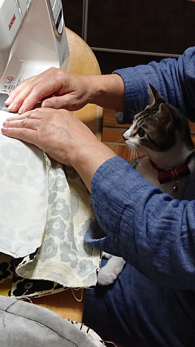 嬶がミシンがけをするのをじっと見つめている。お手伝いがしたいけどお声が全然かからないリンちゃんでした。