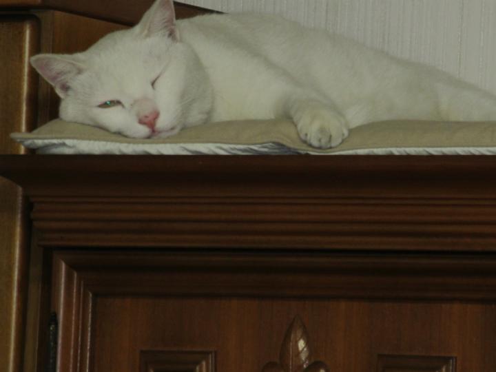 シロちゃんは今日も猫タワーの上に上がってそれから食器棚の上でまったりとしていました