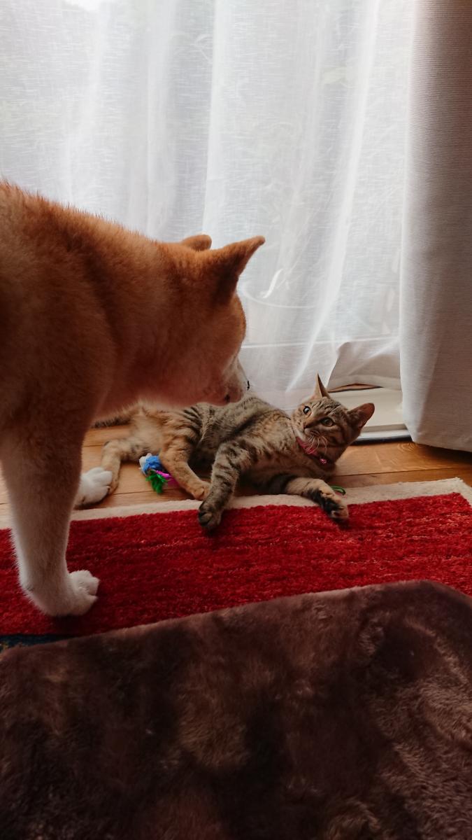 日向ぼっこしている所に、愛犬ハルがご挨拶。小梅ちゃん怖がりません。