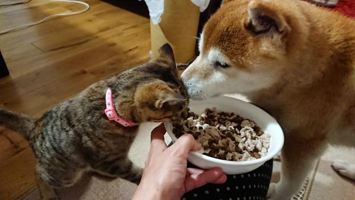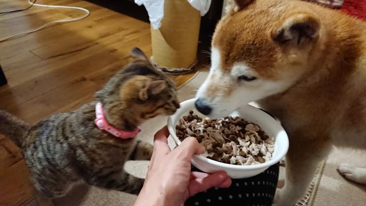 ハルお爺さん(16歳)は怒らず一緒に食べようという感じですが、カリカリ等を食べなくなったら大変なのであげません。