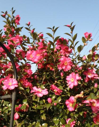 ピンクの山茶花は、秋になると咲き始め、ずっと咲き続けます。