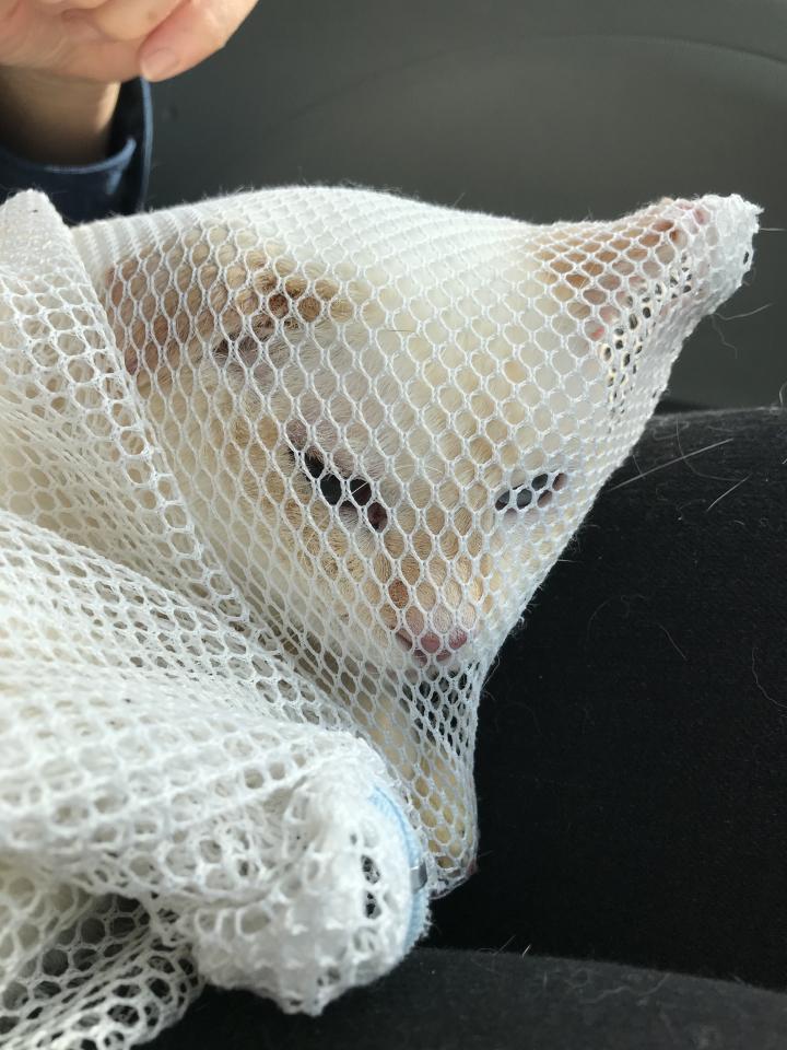 どうにかキャットタワー のハンモックに逃げ込んだところを確保して