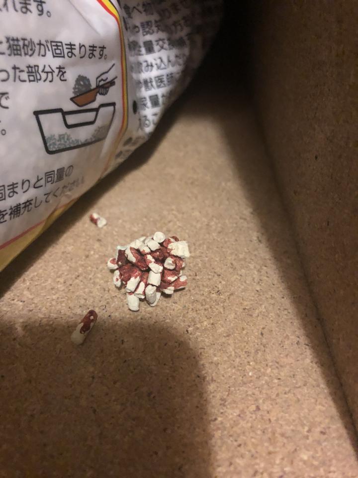 なんじゃこりゃ?どっちが出したものか分からない。2匹とも身体を見てみたけど怪我は無い。てーことは体内から出たもの??