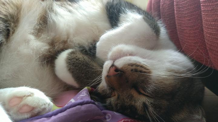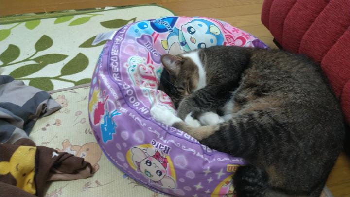 近くで寝ると人の頭に噛みついたり、大福ハンドで猫パンチしてきます(苦笑)