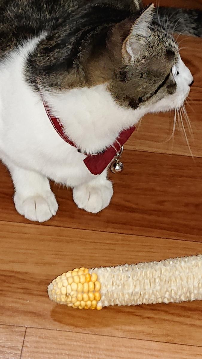 とうもろこしをおもちゃに遊ぶリンちゃんです。
