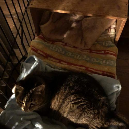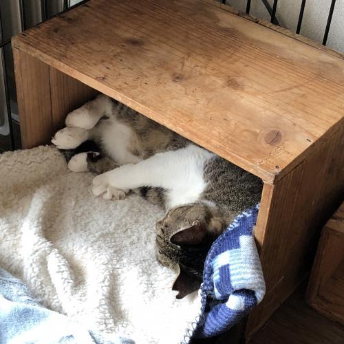 タイガーが寝床の箱に入ったところ、ダンボールでフタをし、箱ごとあさりネットをかぶして箱を取り除く。
