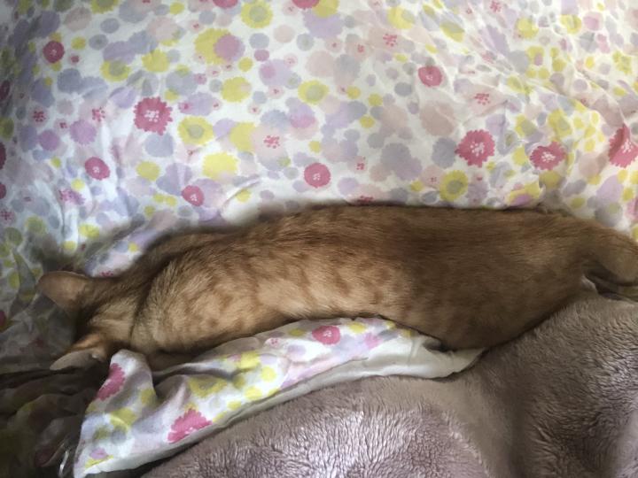 保護猫みかんちゃんベッドで人の上に乗ってくるのすきなんで動けん!笑