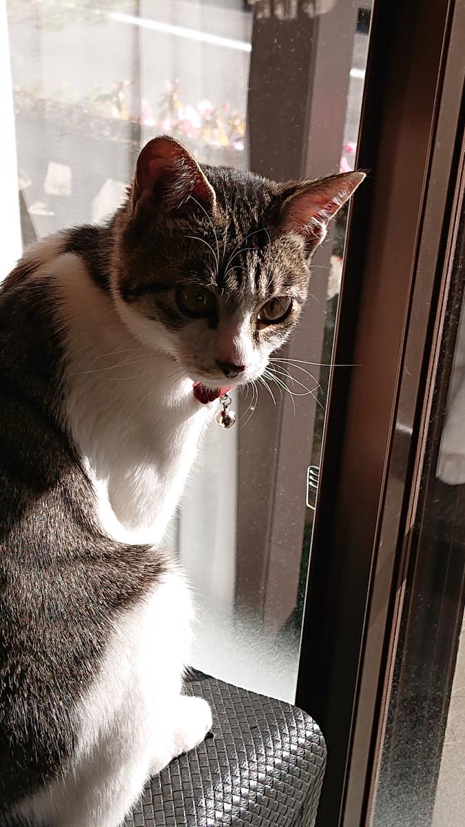 5月25日(日)晴れ 昨日は1日中土砂降りの雨だったが今日は朝からぴーかんのいい天気だ。 外で散歩をする先輩猫のクロちゃんを居間のガラス戸の隙間越しに眺めるリンちゃんでした。