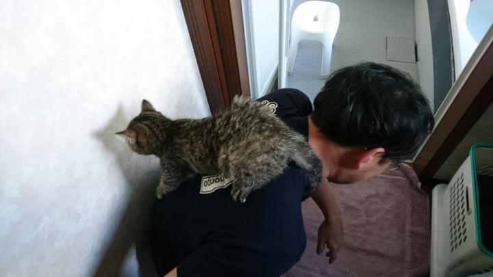 パパさんの体に爪立ててしがみついて、頭通り越して背中まで登って逃げました。