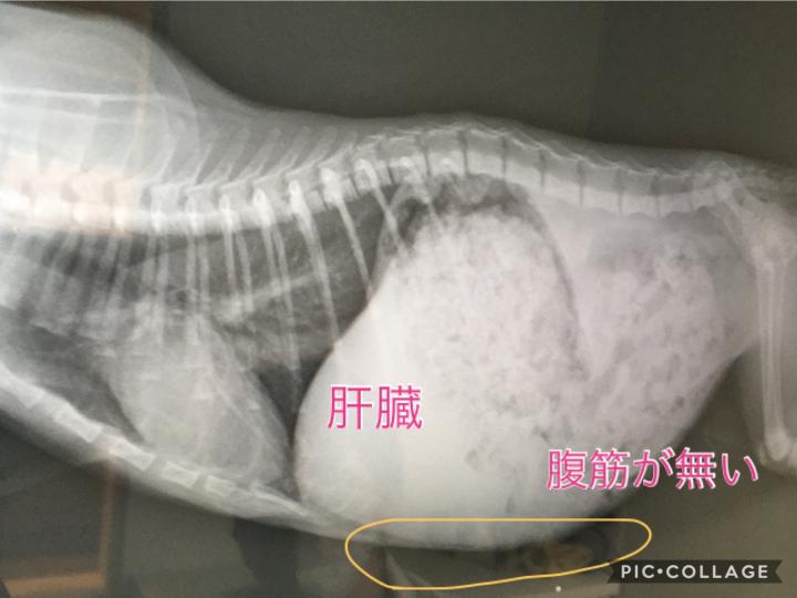 腹筋が一部欠損してて、皮膚だけで繋がっている状態で、肝臓が透けて黒く見えるのだそう。