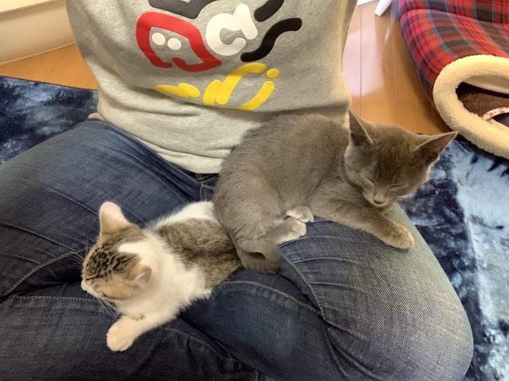 朝ごはんをあげたあと2匹ともお膝に乗ってゴロゴロとしてくれました。