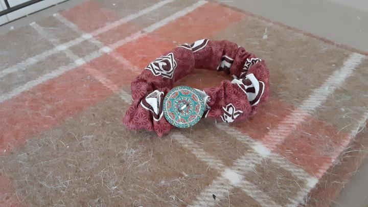 端切れを筒状に縫ってゴムを入れてボタンにゴムをかけている。
