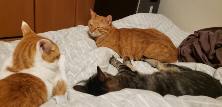さすがにちょっとしんどそうで、布団の上で寝ています。でも、食欲は多少あるみたいです。