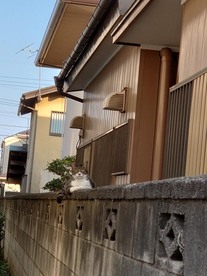 ブロック塀の上から見つめている 母猫 ノンちゃんを 発見しました。