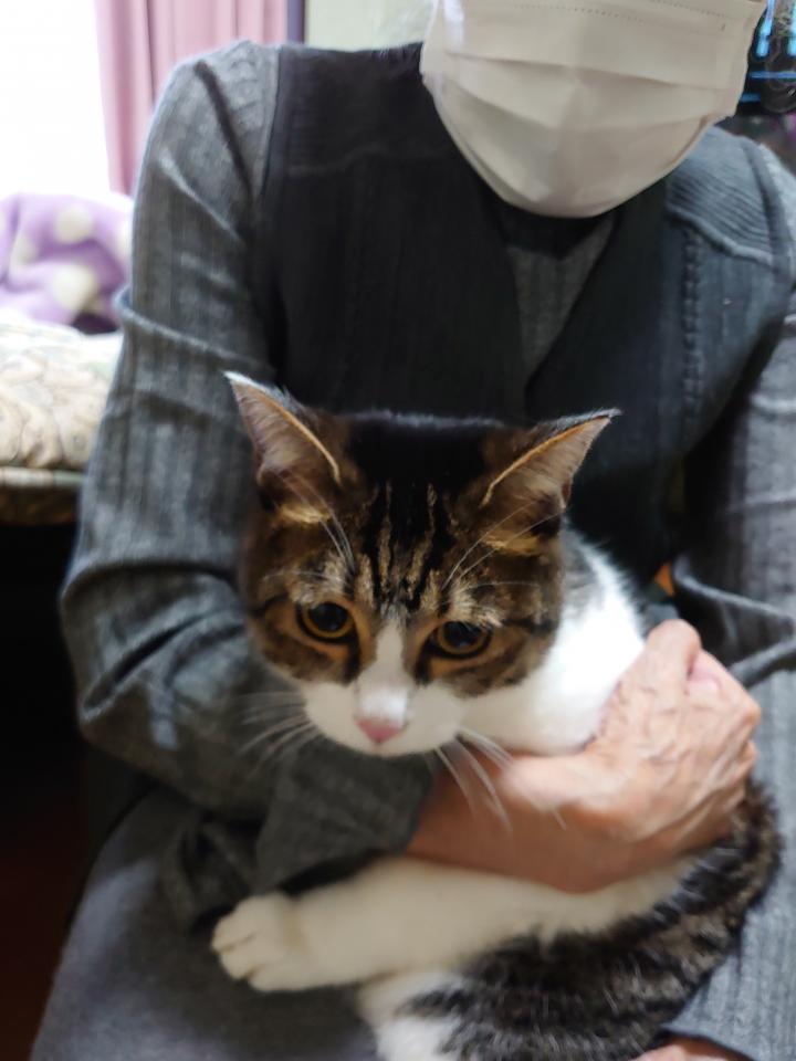 (写真の おばあちゃんが、抱っこしているキジ白の猫ちゃん こつぶ君)