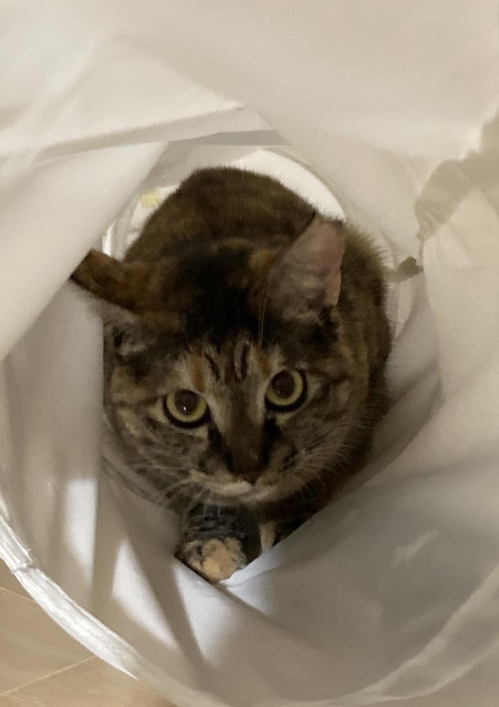 床に寝そべりながら、猫トンネル満喫中のポンちゃんを激写!上目遣いでお目めがまん丸。かわゆし!