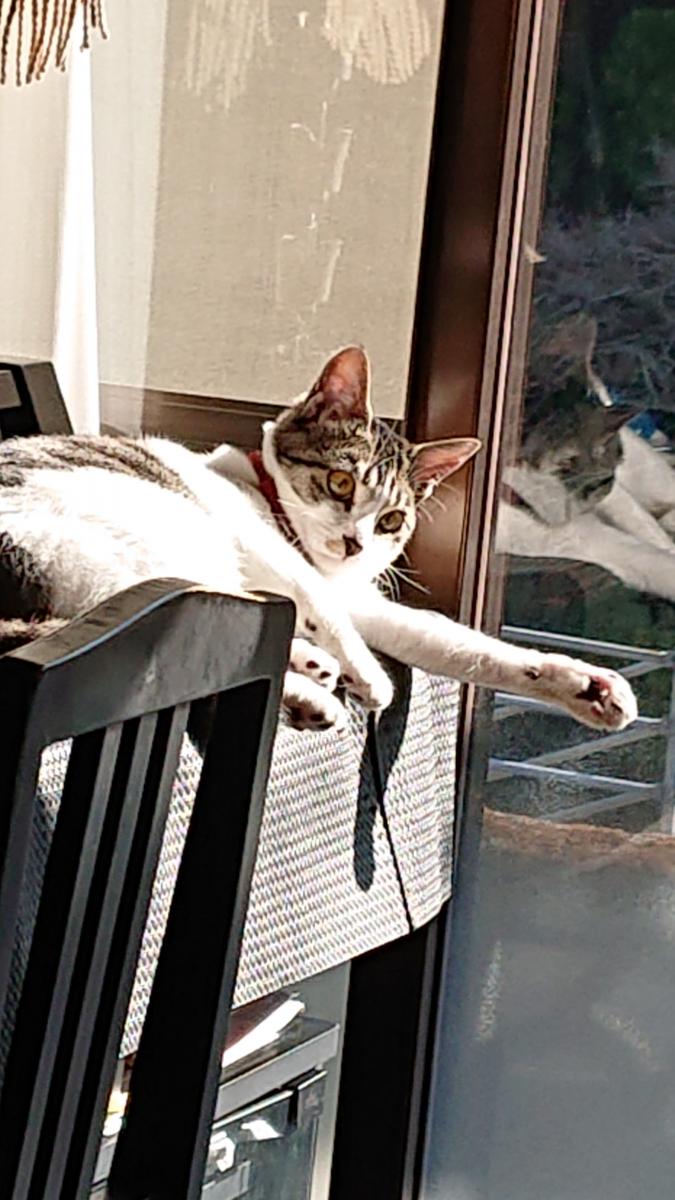 5月25日(日)晴れ 昨日は1日中土砂降りの雨だったが今日は朝からぴーかんのいい天気だ。 外で散歩をする先輩猫のクロちゃんを居間のガラス戸の隙間越しに眺めるリンちゃんでした。