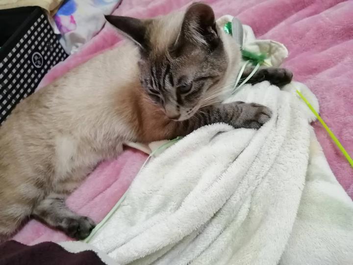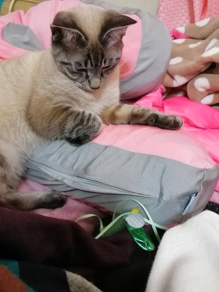 ※うしろに見えるピンクと茶色の水玉のブランケットにしていました。