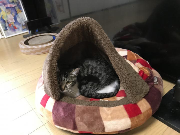 しばらくは購入した「猫が大好きなベッド」の奥から様子をうかがっていましたが、少しずつ新居の冒険にも出かけました。