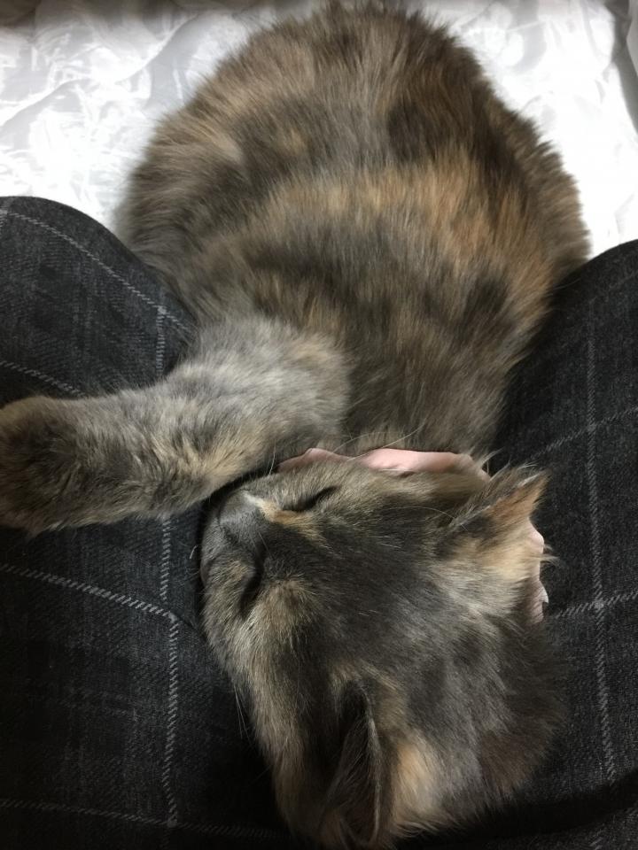 三女は、なぜか股の間に縦向きに挟まって、股に顔を入れたり太股につかまって寝るのが定番。お腹ナデナデはさせるけど、マッサージまではやらせてくれない😢 ママ上手いんだよ…?