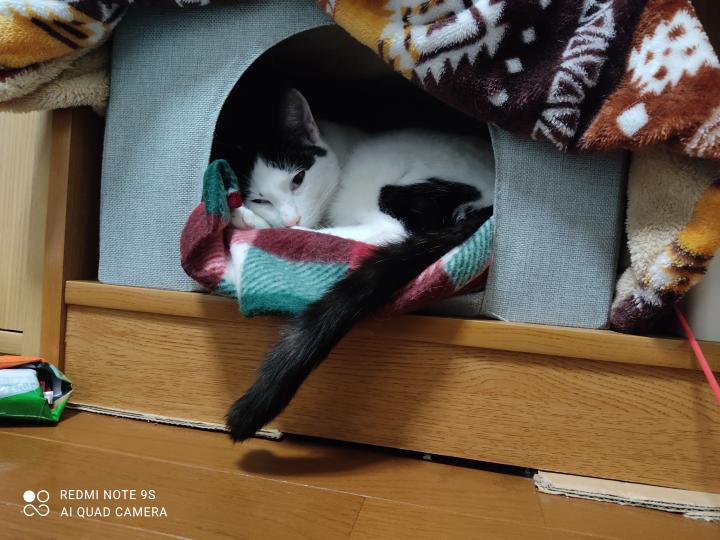 ですが!!日中ペットカメラで見ていたら、本棚ベッドから出てきて身体を伸ばして昼寝をしていました!
