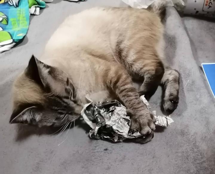 最近新聞を丸めたのがお気に入りで、猫じゃらしを下でカサカサすると