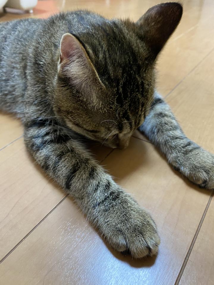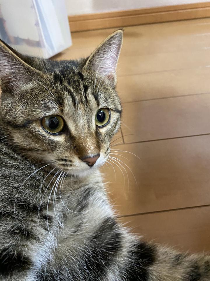ただいまと声をかけると「ニャッ」と返事をして、ニオイをクンクン、そして、脚にスリスリ、椅子に座るとよじ登ってきてアゴに頭突きスリスリ。