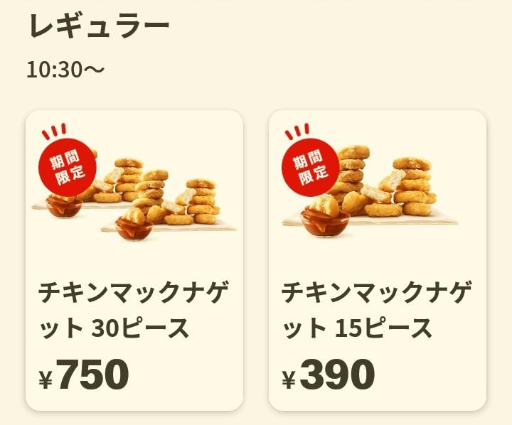 去年同様にマクドナルドはチキン・ナゲットの安売り。今年は更に倍の30ピースが¥750。チキンクリスプバーガーとハンバーガーを合わせて,¥970で2000kcal超のギガ飯として喰うのもアリだったけど、結局,出掛ける気力が無いm(_ _)m