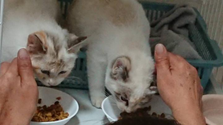 夢中でご飯を食べている事を良い事に、二匹の頭を人差し指を伸ばしてサワサワ‥🎵