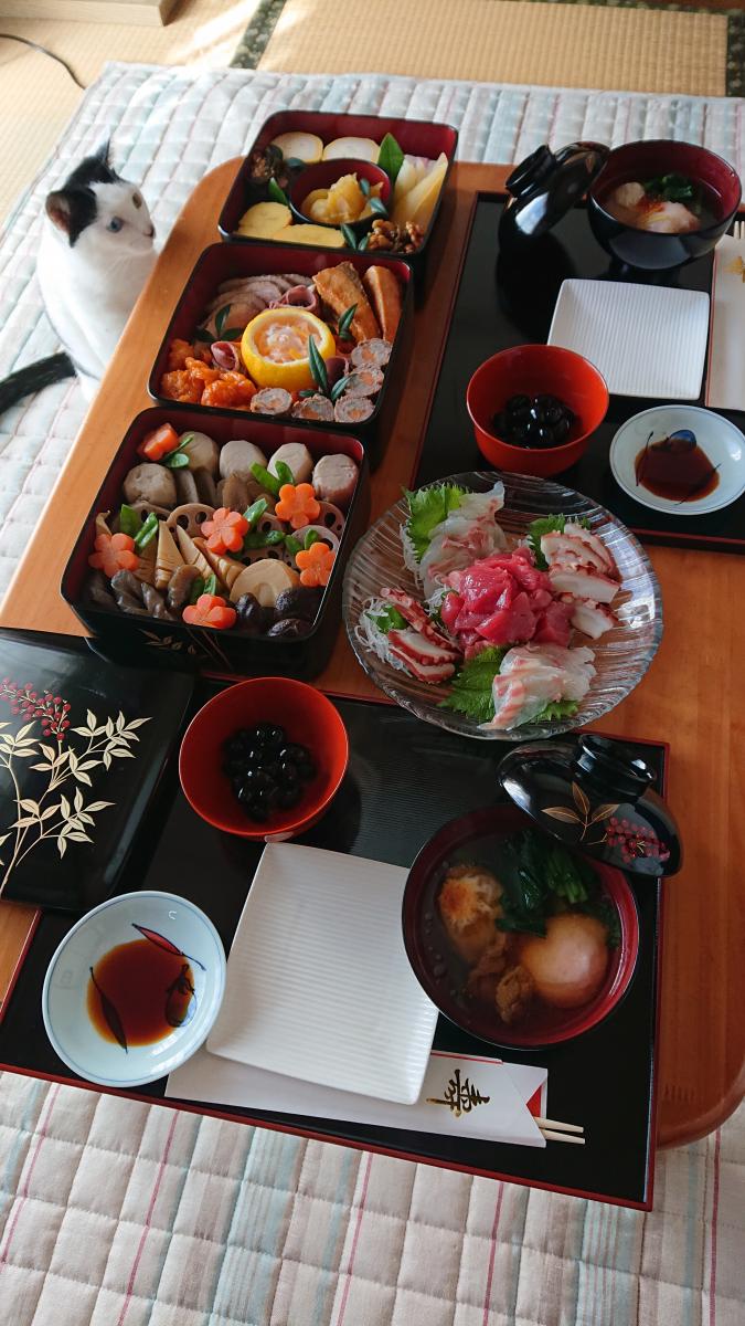 我が家のおせち料理です。つきちゃん、興味津々で獲物を狙う目つき。