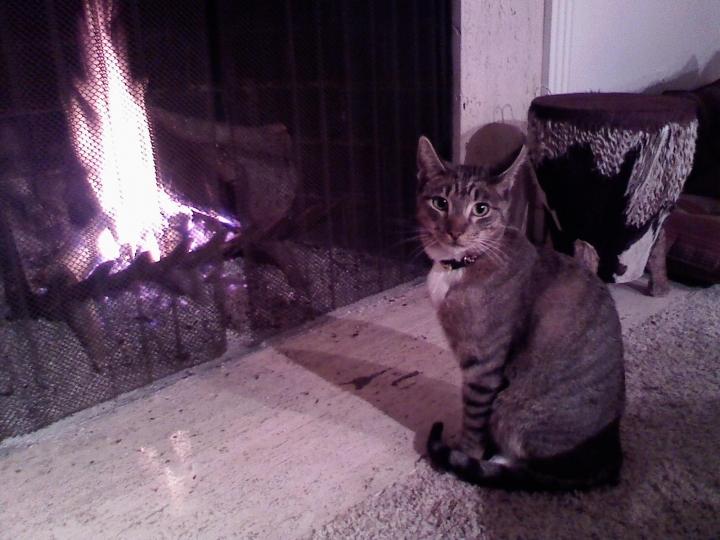 火を焚き始めると、前に座って、火の暖かさをご満喫。