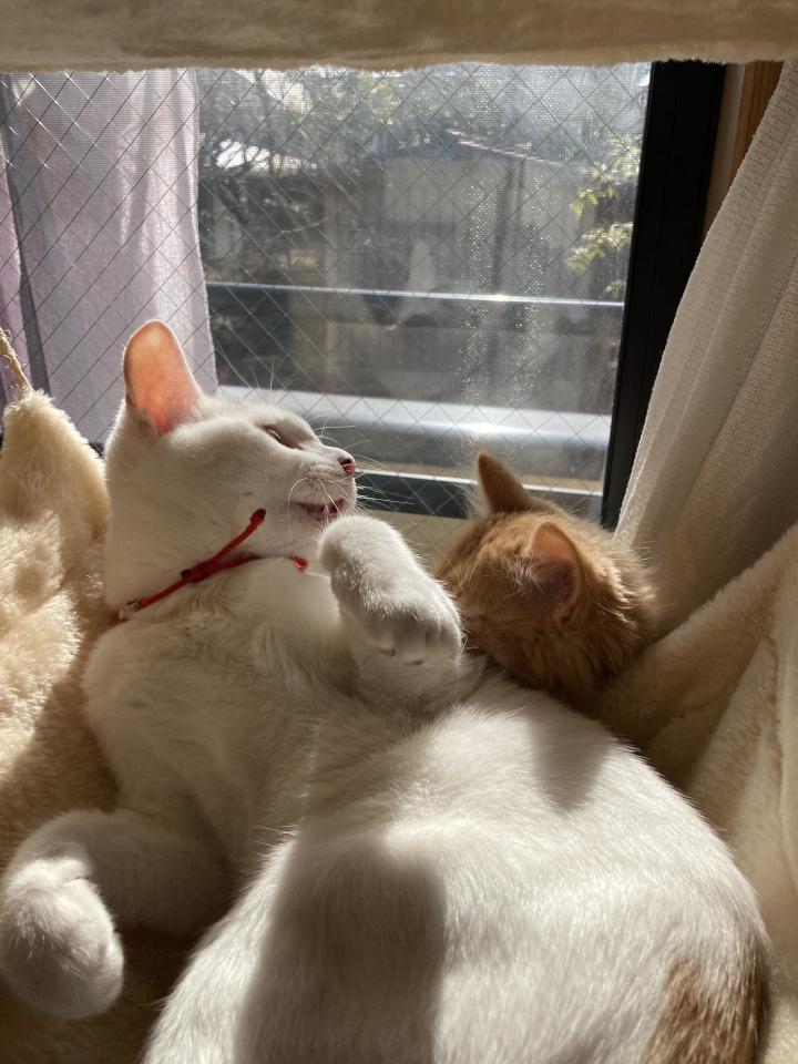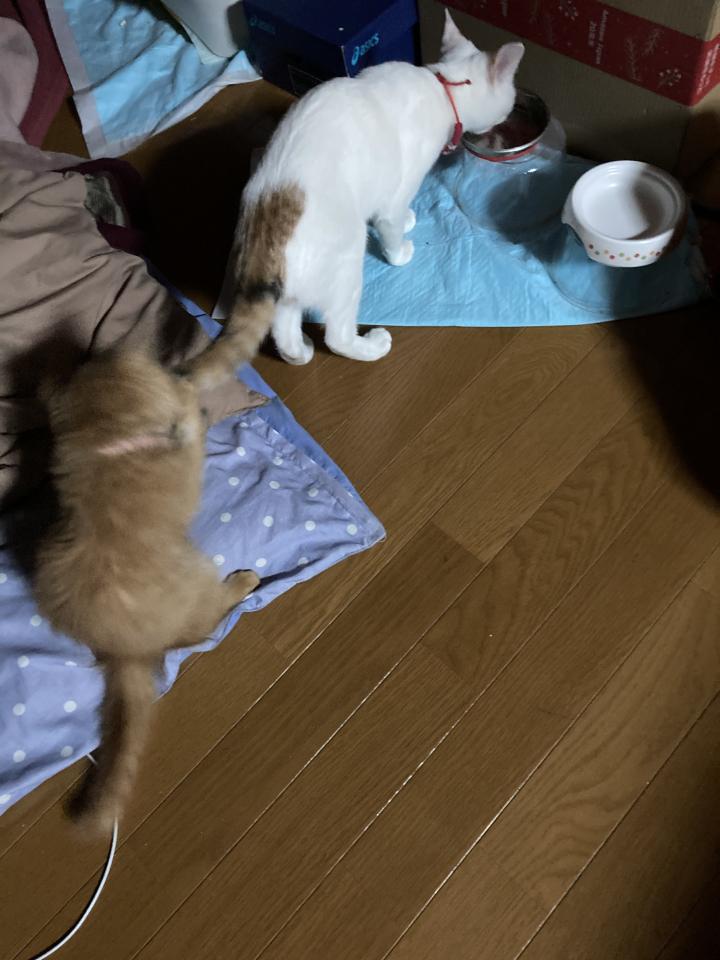 新入りくんは先住ちゃんのしっぽが好きでしょっちゅうイジってたり、いたずらっ子。