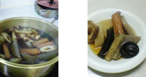 具材は 大根、混布、ごぼう巻き、竹輪、ごぼう、コンニャク、椎茸、写ってないけど卵、と里芋